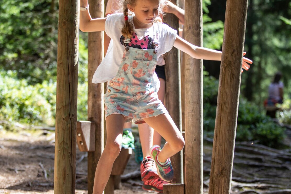 The path now leads about 15 minutes downhill to the Fürstenhof farm and then right along the panorama trail towards Hinterkogel. At the fork turn right into the forest and after a few meters you reach the next playground with exciting stations like adventure bridge, observation tower, magic fountain, ghost moor, a flying fox, and more. There is also a toilet and snack vending machine there.