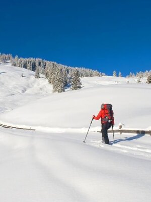 Beautiful route past snow-covered alpine pastures to the Roßkogel viewpoint